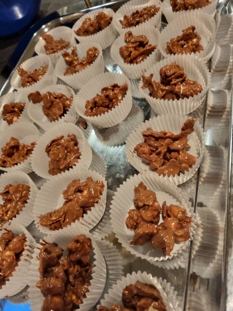 - Blanda i popcorn, cornflakes, mandelspån samt salt i chokladen