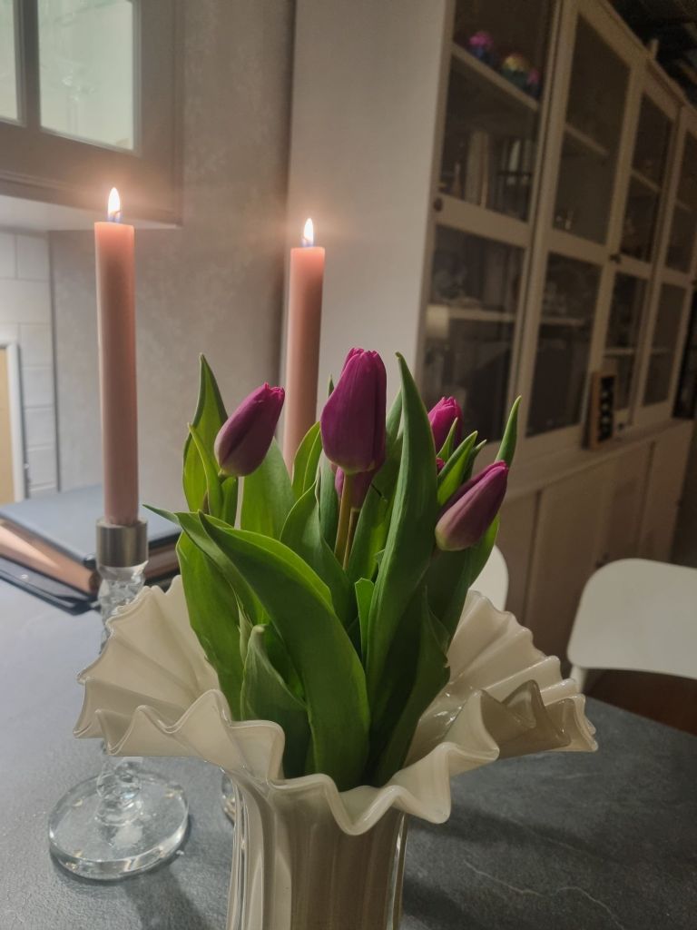 När vi var och handlade slank dessutom årets första tulpaner ner i vagnen. Som jag har längtat. Bästa blomman och bästa känslan. När tulpanerna kommer in vet man att vi sakta men säkert går mot ljusare tider – underbart.