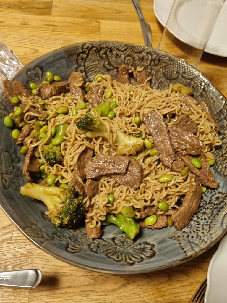 Men nu kommer ett tips på en maträtt med nudlar, biff och sojabönor. Ludvig som är otroligt skeptisk till allt som är grönt älskade bönorna och åt bara bönor på slutet. Bra betyg 🙂